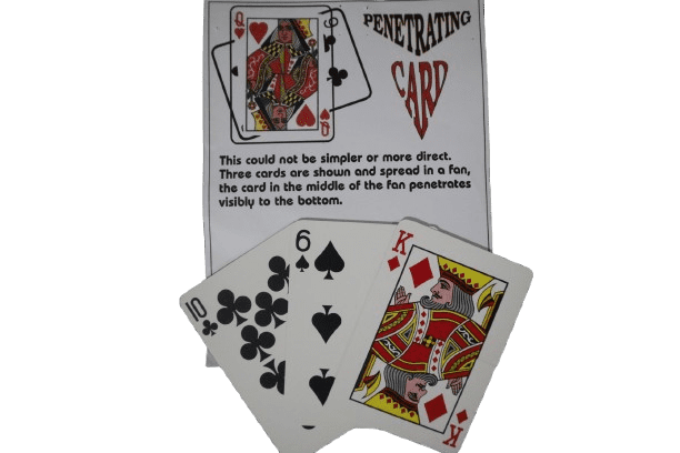 Effect: A selected card, which is initially placed in the middle of a three-card fan, visibly and seemingly impossibly travels or “penetrates” through the other cards to the bottom of the fan.
