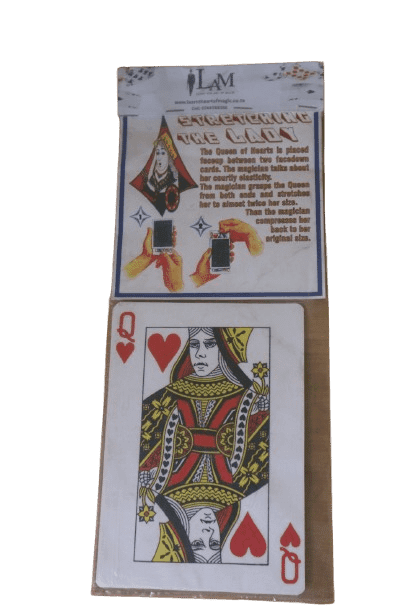 Stretching the Queen is a visual packet magic trick where a playing card,tyically a Queen,appears to impossibly stretch to a longer length and then return to nor.al size.It is a popular close up ,”packet tricks” often used by table hopping.
